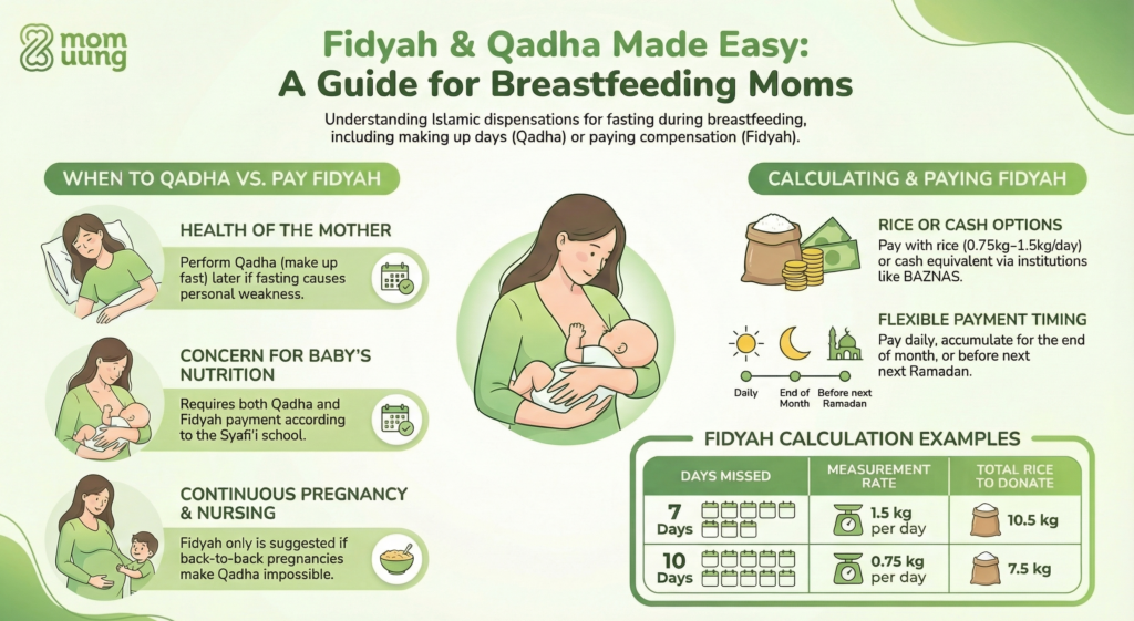 - Khawatir untuk bayi: Kalau Mommy sehat tapi takut produksi ASI berkurang, Mazhab Syafi’i menyarankan qadha sekaligus bayar fidyah.